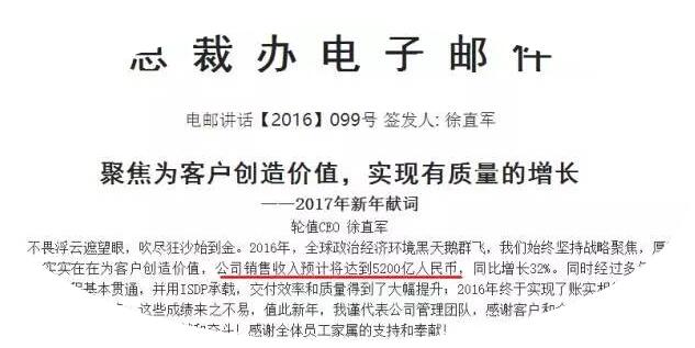 2016年12月30日,华为轮值CEO徐直军宣布,2016年销售收入达到5200亿人民币,同比增长32%。