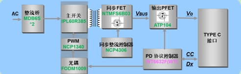 该设计主要采用安森美半导体的初级端高频准谐振反激式PWM控制器NCP1340、次级端同步整流控制器NCP4306、同步FET NTMFS6B03、开关FET ATP104和伟诠的PD3.0协议控制器WT6632F/WT6615F。方案框图如图1所示。