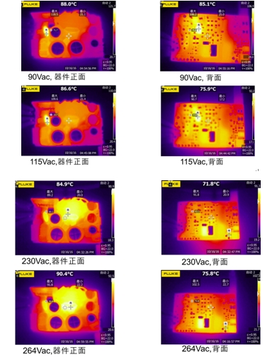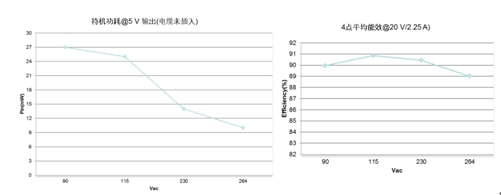 我们在90 Vac、115 Vac、230 Vac、264 Vac条件下,测得该方案于5 V输出(电缆未插入)的待机功耗都低于27 mW,在评估板端测得在115 Vac和230 Vac的条件下,20 V/2.25 A输出的平均能效超过90%。