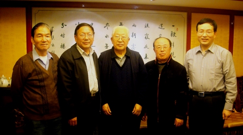 协会领导理事长韩永宽(右2)、监事长奚必云(左1)、秘书长孙京伟(右1)与市人大副主任金生官(左2)、原市委工业部部长刘才(中)在一起。
