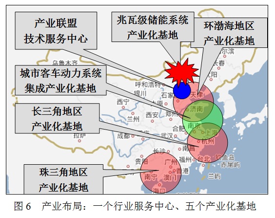 根据《规划》“根据产业政策积极引导地方和社会投资,既要鼓励积极性高、具备一定条件的企业从事新能源汽车及零部件生产,又要防止一哄而起,避免低水平盲目投资和重复建设”;“重点建设京津、珠三角、长三角地区动力电池产业聚集区域”;“培育形成若干具有较强国际竞争力的节能与新能源汽车整车和关键零部件企业集团”; “重点支持形成若干家具有较强国际竞争力的关键零部件企业集团”的精神,拟在产业联盟的框架内,首先在长三角、珠三角和环渤海地区,依托相关企业建设3个“蓄电池储能电源系统”和“纯电动乘用车动力集成系统”区域性产业化基地。依托相关企业建设1个商务客车动力集成系统产业化基地。组织机构如图7。