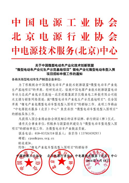依据中国电源工业协会、北京电源行业协会、中电源技术服务(北京)中心“关于中国微型电动车产业化技术创新联盟《微型电动车产业化生产示范基地项目》锂电产业化微型电动车型入围项目招标申报工作的通知”的精神,为了积极配合中国微型电动车产业技术创新联盟“微型电动车产业化生产基地项目”的开展,经研究决定,依托中国电源产业技术创新联盟电动车动力总成产业化示范基地—北京控股集团京仪敬业电工科技有限公司技术与销售网络渠道,就“微型电动车产业化生产示范基地项目”,在全国开展“锂电产业化微型电动车型选型入围项目”的招标工作。此项工作将由“中电源技术服务(北京)中心”负责承担“微型电动车选型入围项目”的招标具体工作。