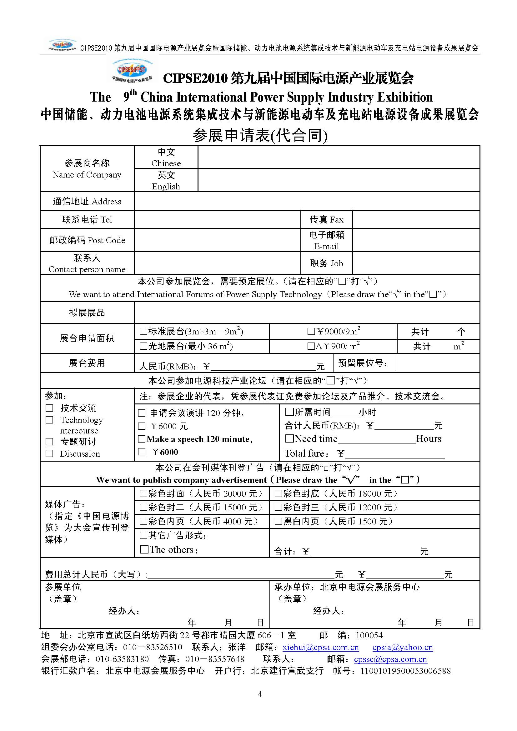 银行汇款户名:北京中电源会展服务中心 开户行:北京建行宣武支行 帐号:11001019500053006588