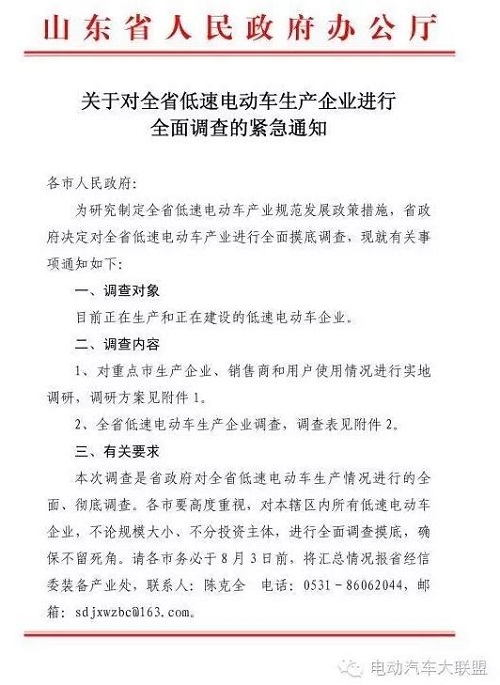 山东省人民政府办公厅7月27日下发了《关于对全省低速电动车生产企业进行全面调查的紧急通知》。