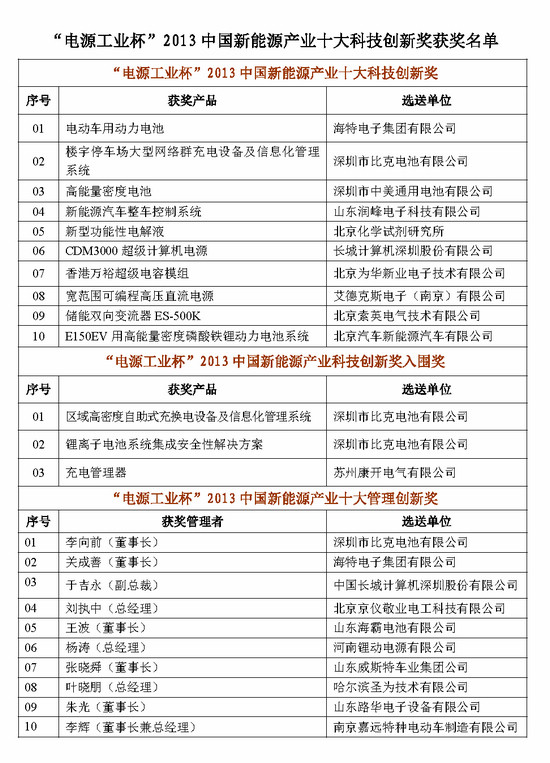 附:2013中国新能源产业十大科技创新奖获奖名单
