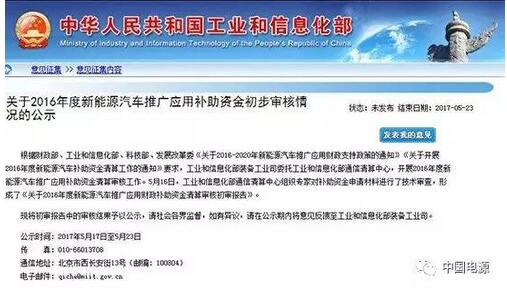 此次公示是根据财政部、工业和信息化部、科技部、发展改革委《关于2016-2020年新能源汽车推广应用财政支持政策的通知》《关于开展2016年度新能源汽车补助资金清算工作的通知》要求,工业和信息化部装备工业司委托工业和信息化部通信清算中心,开展2016年度新能源汽车推广应用补助资金清算审核工作。5月16日,工业和信息化部通信清算中心组织专家对补助资金申请材料进行了技术审查,形成了《关于2016年度新能源汽车推广应用财政补助资金清算审核初审报告》。