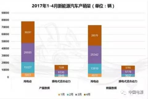 2017年前四个月,中国新能源汽车销量90402,同比下降0.2%。其中,纯电动车销量为72895辆,同比增长9.7%;插电式混合动力车销量为17507辆,同比下降27.4%。