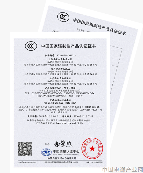近日,创四方集团旗下福建创四方新能源科技有限公司自主研发的CSF-EV-D80~160KW-380VAC-D系列一体式直流充电桩,顺利通过国家强制性产品认证(CCC认证),正式斩获3C认证证书。